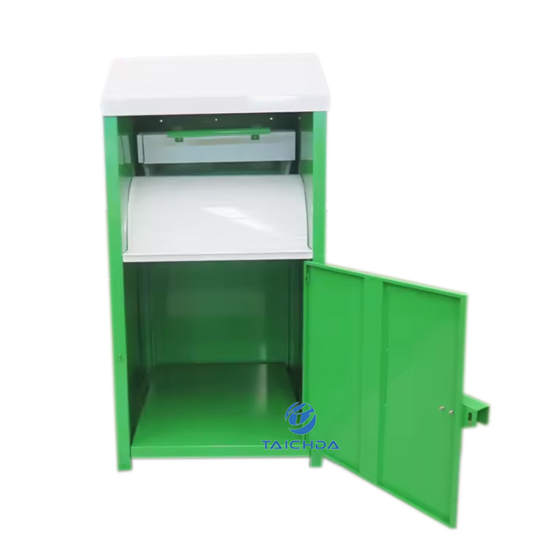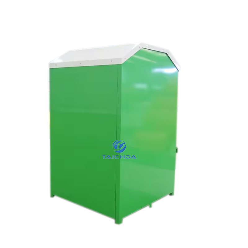 أبعاد المنتج: 1070 مم × 1070 مم × 1800 مم. سلة إعادة تدوير الملابس والأحذية والمنسوجات. مصنوعة من الفولاذ المجلفن السميك، مقاومة للتآكل والصدأ، بتصميم ذي سعة كبيرة، صديقة للبيئة وذات مظهر جمالي، مناسبة للأماكن الخارجية مثل الأحياء والشوارع ومراكز التسوق.